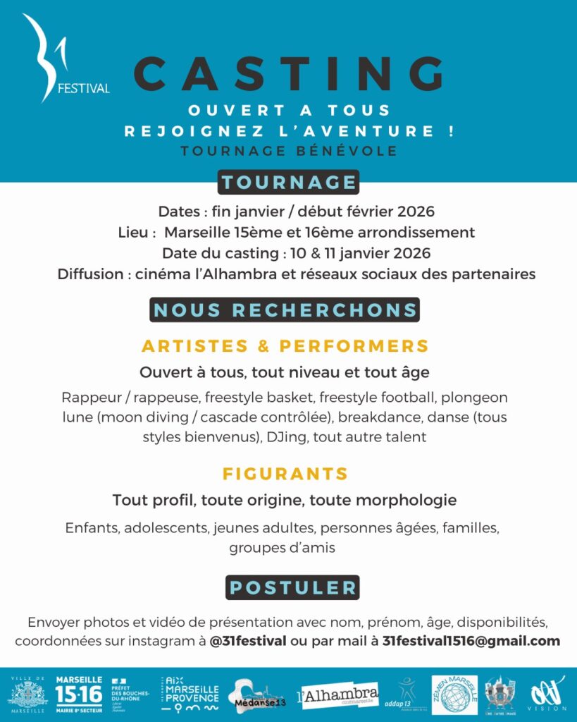 Le 31 Festival lance un casting ouvert à toutes et à tous pour un tournage bénévole qui se déroulera fin janvier / début février 2026 dans les 15e et 16e arrondissements de Marseille.