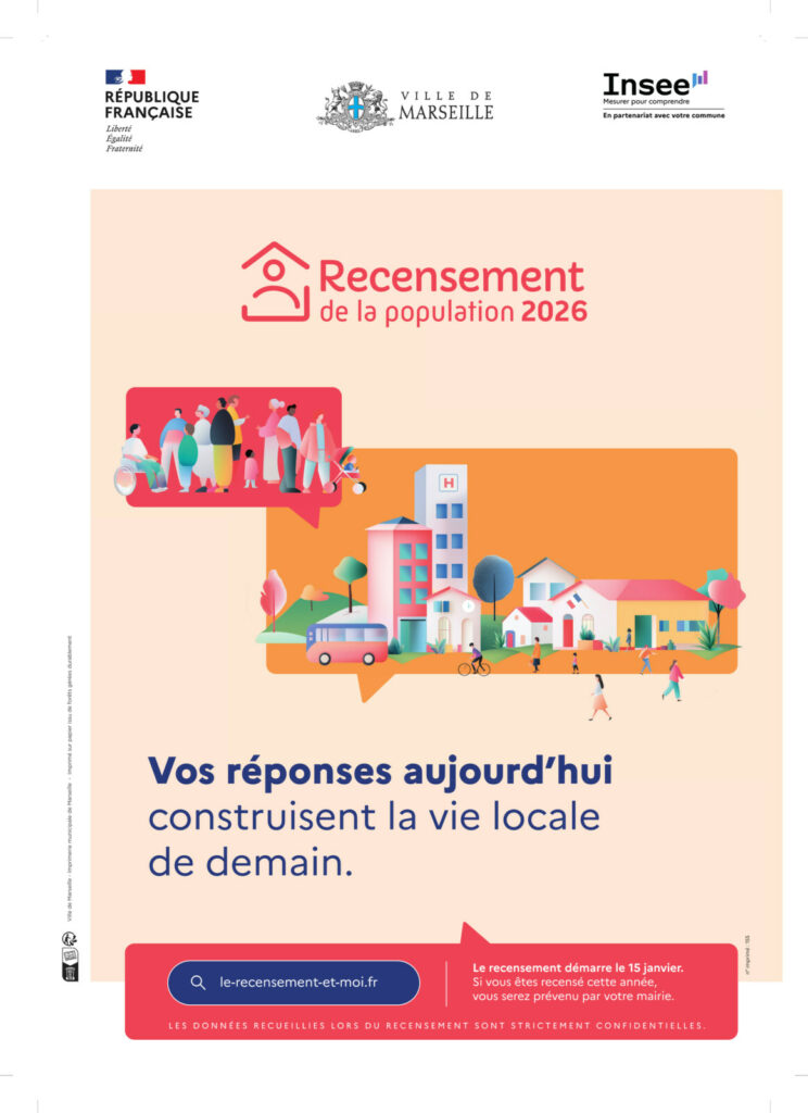 Organisé par l’Insee (Institut national de la statistique et des études économiques), le recensement de la population aura lieu du 15 janvier au 21 février 2026. Si vous êtes recensé(e) cette année, vous serez prévenu(e) par la Ville de Marseille.